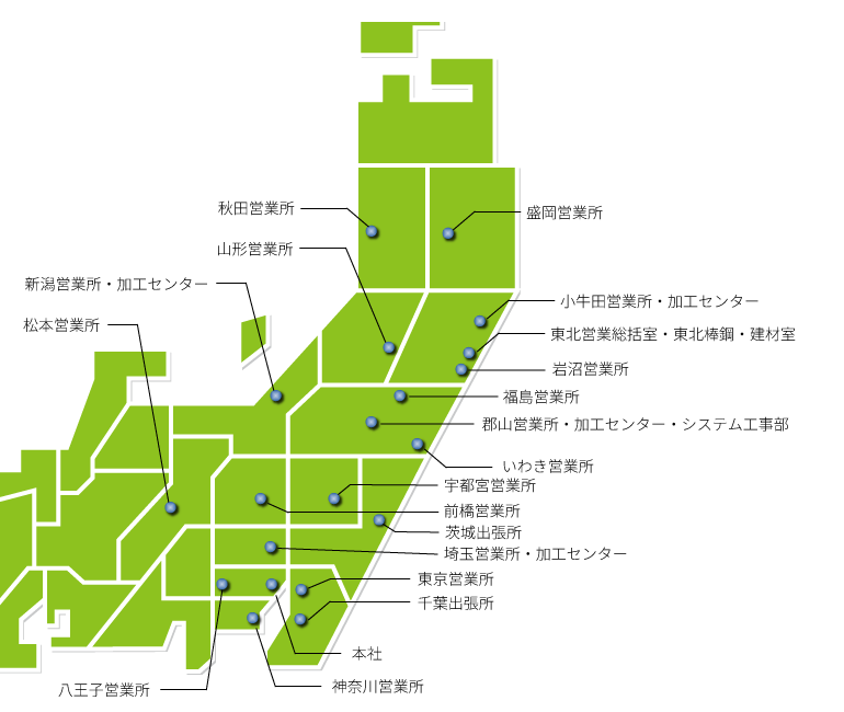 東北の各地区の現場へ、鋼材製品を中心に、各種建設資材を販売・納入致しますので、お気軽にお問合せください。